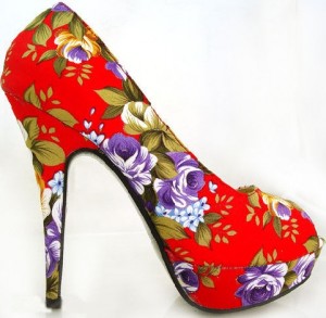 Çiçek desenli kırmızı platform tabanlı bayan ayakkabı modeli